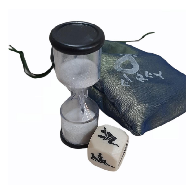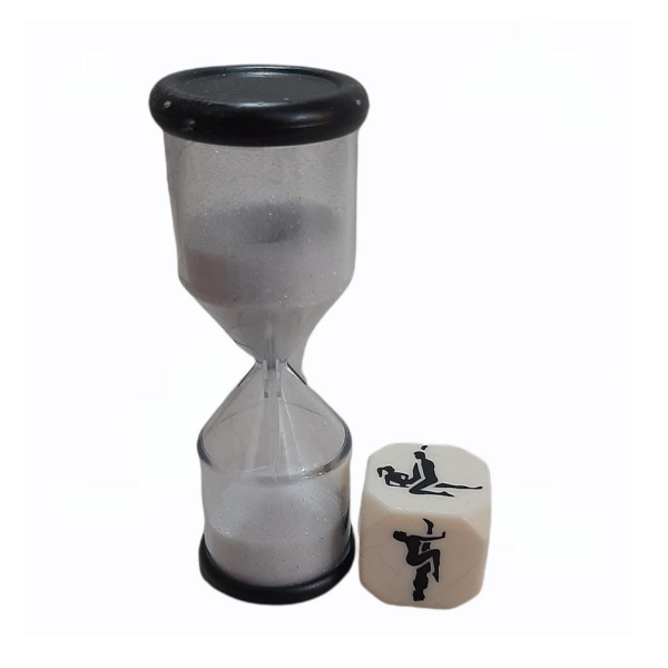 Incluye: 1 dado con posiciones de kamasutra distintas en cada cara y 1 reloj de arena. Bolsita de terciopelo.